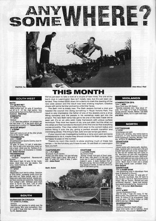 The Bath mini is totally new. The Bath skaters formed a club and hassled the council into doing something in Royal Victoria Park. The result is very impressive: the father of one of the skaters owns a shop fitting company and the people in his workshop really got into the project. The new Bath ramp has got to be one of the best made we’ve seen yet. It’s on an ultra solid metal framework with unique surface technique. They took two layers of ply, one just plain, but the other cut into strips and then bonded to the back of the first one so that everything curves smoothly. Then they rolled 3mm steel to the correct radius and before fitting it onto the ply, giving a perfect smooth transition and minimising stress. This thing is fast, solid and (as ramps go) silent.If your council are investigating building a ramp and want someone professional to do it, maybe they should contact the Bath people. We’d be happy to pass on the number.