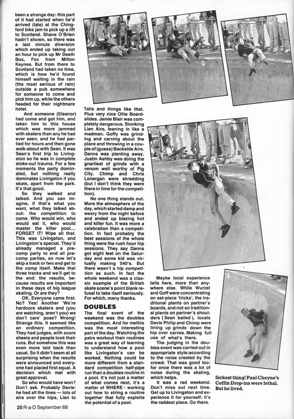 Livingston skatepark has always placed the emphasis on pure fun, rather than serious competition. There was a competition on this day, complete with judges, but at the end they announced that everyone had placed first. My type of competition. Events like this were also a great chance to print pictures of people doing strange and gnarly things rather than concentrating purely on the latest and most ambitious trick. A happy day all round.