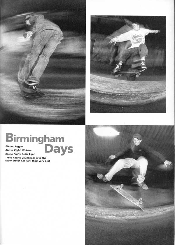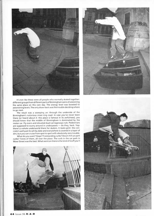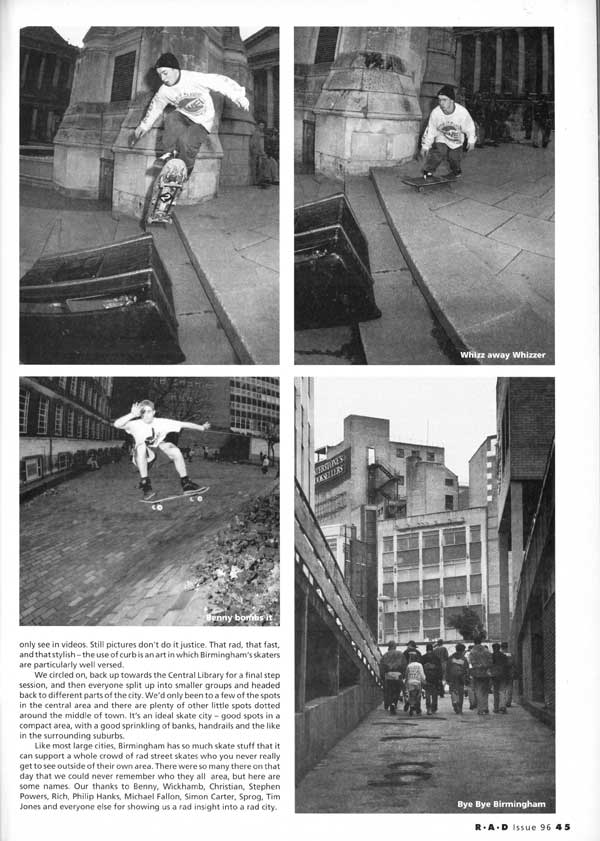 Like most large cities, Birmingham has so much skate stuff that it can support a whole crowd of rad street skaters who you never really get to see outside of their own area. There were so many there on that day that we could never remember who they all are, but here are some names. Our thanks to Benny, Wickhamb, Christian, Stephen Powers, Rich, Philip Hanks, Michael Fallon, Simon Carter, Sprog, Tim Jones and everyone else for showing us a rad insight into a rad city.NAMES: