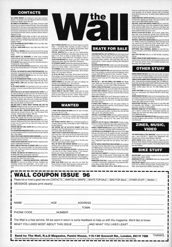 The Wall was a far from perfect market-place, notorious for inflated ideas of what a worn-out deck might be worth. It was also one part of the magazine where the voice of the readers could be heard. It was far easier to send in an entry for the Wall than to write a letter and risk having some silly editorial comment tacked on to the end of it. A fair bit of slagging off went on in here, and the readers could use far stronger language than we allowed within the editorial content, but we had relatively few problems. Numbers and addresses have been blanked now.CONTACTS