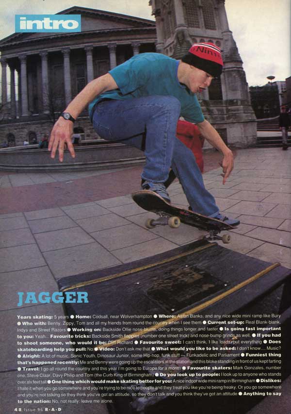 So here’s what we said then:Years skating: 5 years Home: Codsall, near Wolverhampton Where: Aston Banks, and any nice wide mini ramp like Bury Who with: Benny, Zippy, Tom and all my friends from round the country when I see them Current set-up: Real Blank-blank, Indys and Street Razors Working on: Backside Ollie nose-blunts, doing things longer and faster Is going fast important to you: Yeah… Favourite tricks: Backside Smith flappies (number one street trick) and nose-bump grinds as well. If you had to shoot someone, who would it be: Cliff Richard Favourite sweet: I can’t think, I like loads, put everything Does skateboarding help you pull: No Video: Don’t ask me that What would you like to be asked: I don’t know…. Music? Alright: A lot of music, Sonic Youth, Dinosaur Junior, some Hip-hop, funk stuff — Funkadelic and Parliament Funniest thing that’s happened recently: Me and Benny were going up the escalators at the station and this bloke standing in front of us kept farting Travel: I go all round the country and this year I’m going to Europe for a month Favourite skaters: Mark Gonzales, number one, Steve Claar, Davy Philip and Tom (the Curb King of Birmingham) Do you look up to people: I look up to anyone who stands over six feet tall One thing which would make skating better for you: A nice indoor wide mini ramp in Birmingham Dislikes: I hate it when you go somewhere and you’re trying to be nice to people and they treat you like you’re being freaky. Or you go somewhere and you’re not talking so they think you’ve got an attitude, so they don’t talk and you think they’ve got an attitude Anything to say to the nation: No, not really: leave me alone.