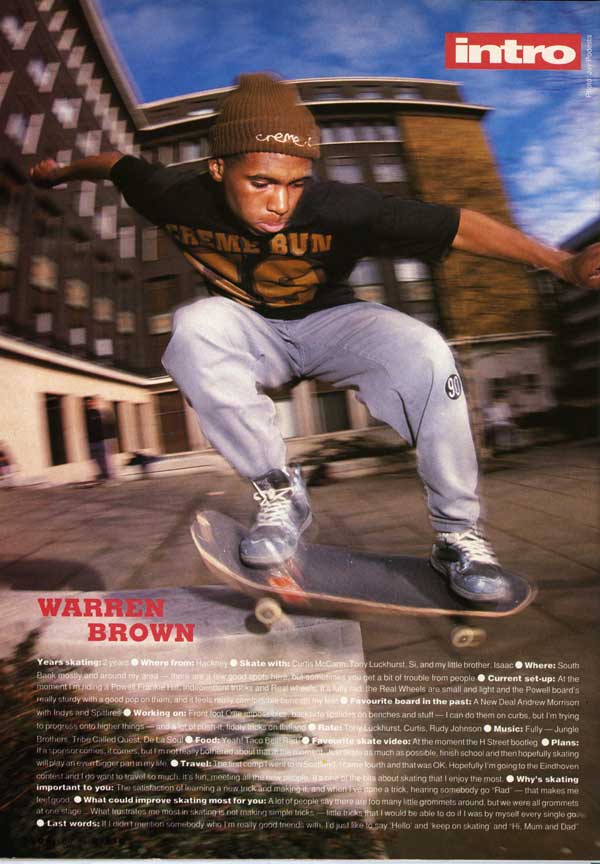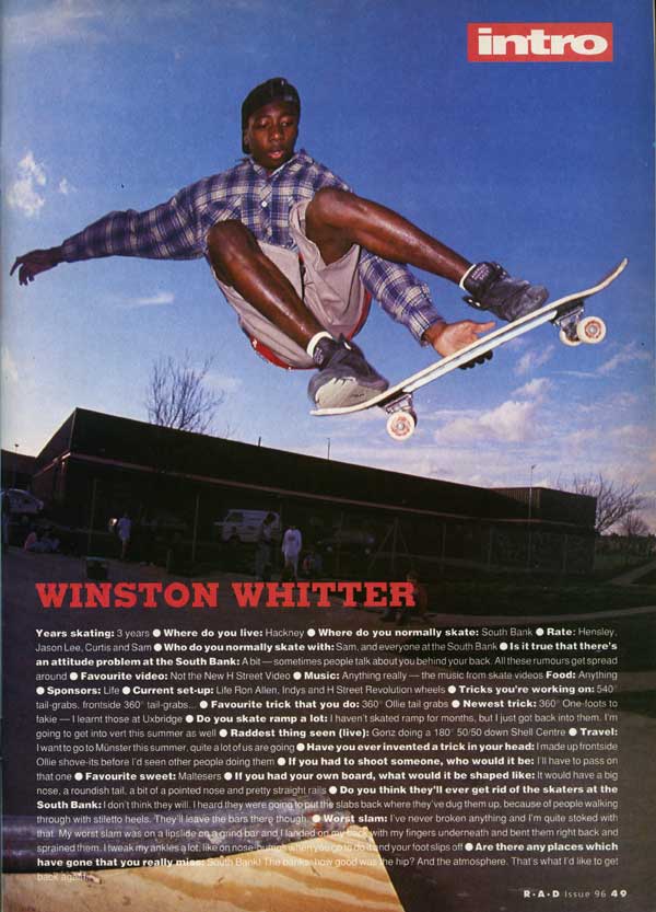 Anyway, this is what Winstan had to say in 1991:Years skating: 3 years Where do you live: Hackney Where do you normally skate: South Bank Rate: Hensley, Jason Lee, Curtis and Sam Who do you normally skate with: Sam, and everyone at the South Bank Is it true that there’s an attitude problem at the South Bank: A bit — sometimes people talk about you behind your back. All these rumours get spread around Favourite video: Not the New H Street Video Music: Anything really — the music from skate videos Food: Anything Sponsors: Life Current set-up: Life Ron Allen, Indys and H Street Revolution wheels Tricks you’re working on: 540° tail-grabs, frontside 360° tail-grabs… Favourite trick that you do: 360° Ollie tail grabs Newest trick: 360° One-foots to fakie — I learnt those at Uxbridge Do you skate ramp a lot: I haven’t skated ramp for months, but I just got back into them. I’m going to get into vert this summer as well Raddest thing seen (live): Gonz doing a 180° 50/50 down Shell Centre Travel: I want to go to Münster this summer, quite a lot of us are going Have you ever invented a trick in your head: I made up frontside Ollie shove-its before I’d seen other people doing them If you had to shoot someone, who would it be: I’ll have to pass on that one Favourite sweet: Maltesers If you had your own board, what would it be shaped like: It would have a big nose, a roundish tail, a bit of a pointed nose and pretty straight rails Do you think they’ll ever get rid of the skaters at the South Bank: I don’t think they will. I heard they were going to put the slabs back where they’ve dug them up, because of people walking through with stiletto heels. They’ll leave the bars there though. Worst slam: I’ve never broken anything and I’m quite stoked with that. My worst slam was on a lipslide on a grind bar and I landed on my back with my fingers underneath and bent them right back and sprained them. I tweak my ankles a lot, like on nose-bumps when you go to do it and your foot slips off Are there any places which have gone that you really miss: South Bank! The banks: how good was the hip? And the atmosphere. That’s what I’d like to get back again.