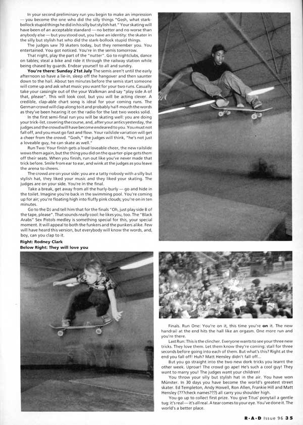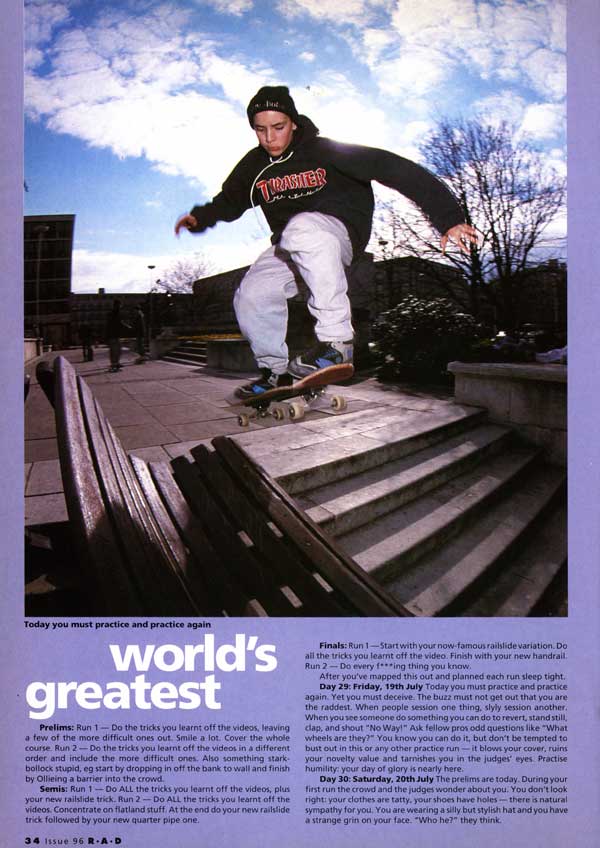 Interesting to note the coy: “f***ing”. We didn’t normally used asterisks. We didn’t normally use words which might have needed them (although the readers were allowed more freedom in the classified adverts). I was always pleased when parents and the like were offended by ‘bad language’ which wasn’t actually there. It meant we had managed to get the tone right. Asterisks would have meant we were unable to sound right without relying on specific words. Mind you, sometimes we mucked things up.Prelims: Run 1 — Do the tricks you learnt off the videos, leaving a few of the more difficult ones out. Smile a lot. Cover the whole course. Run 2 — Do the tricks you learnt off the videos in a different order and include the more difficult ones. Also something stark-bollock stupid, eg start by dropping in off the bank to wall and finish by Ollieing a barrier into the crowd.