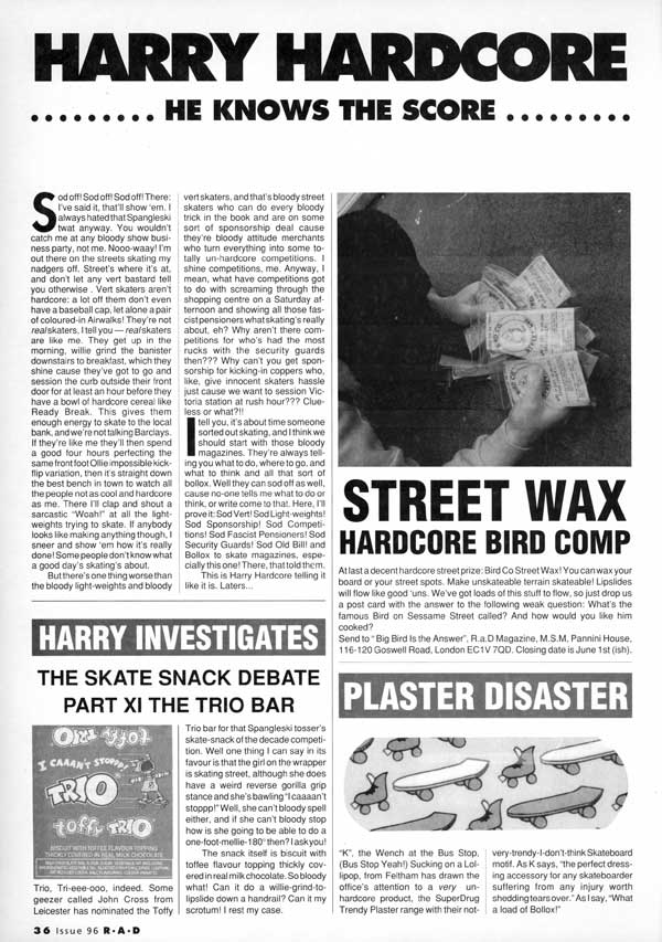 This run of pages seems to be a real Gav fest. The much-hated Ricky Spangles, a.k.a Spangleski had finally been buried, probably as a result of reader pressure. And pressure closer from within the team as well, I suspect. So here we have “Harry Hardcore”, Gavin’s nod to all those who could tell (and the telling was important to them) who was and who wasn’t a real skater. Have things changed? Maybe all those ‘was’ should be ‘is’?