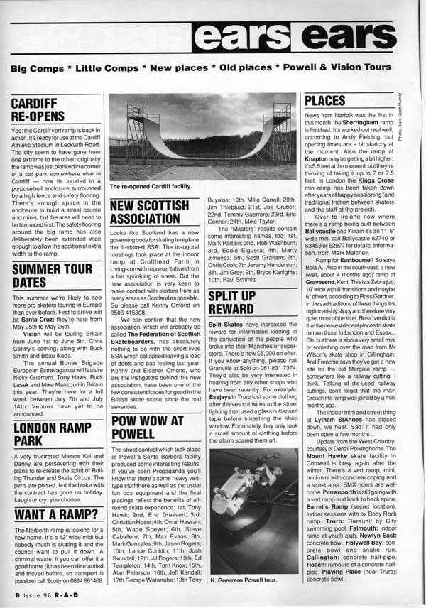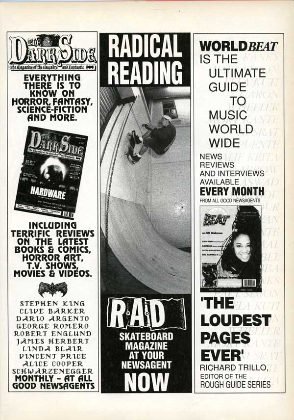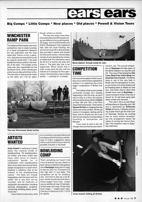 Buck Smith has moved over from Sims to Vision and his new board has a more commercial shape. This board has V6 concave on its 14″ wheelbase, cartoon graphics and excellent finish. Overall specs: 32″ by 9.625″ with 6.125″ nose and 6.375″ tail. Don’t forget Vision rails if you’re looking to slide these boards: here we show Vision Type 2 Rails which are really chunky and good value at £3.99 — plenty of plastic for your cash. There are also Vision “Anti-vibe” rails with rubber backing to keep noise to a minimum for bust-free skating. What I like most about these rails is that they come with wood screws, but if you read the warranty that the boards carry you’ll discover you could be in breach of it: “To protect you warranty… mount all accessories with T bolts (sex-bolts) only.” If this does void the manufacturer’s warranty, you’ll see who’s really getting screwed when you also read the following advice: “Special T nuts and screws are available at your authorised Vision dealer…” But not as part of the price with these rails!!