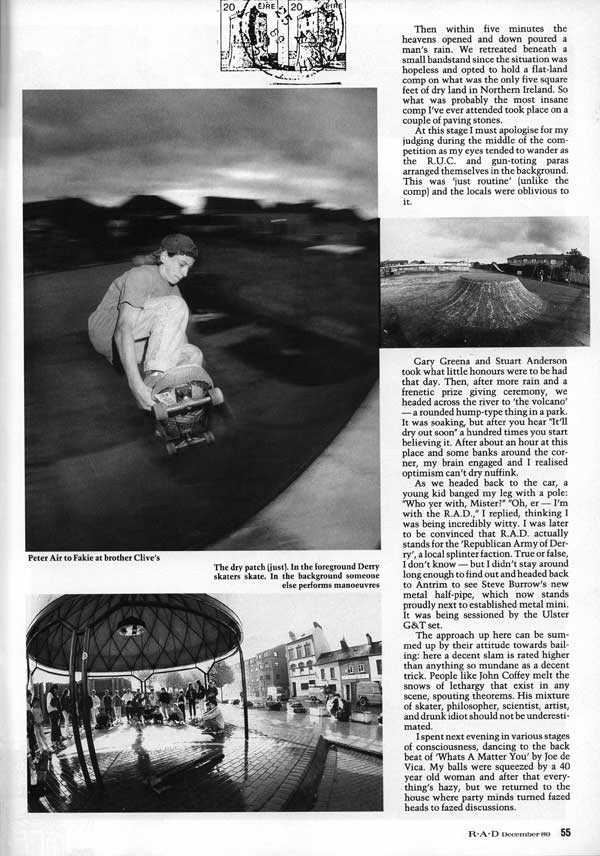 ‘Troubles’ was the after-dark topic. John Coffey’s troubles were ones of the soul: he’d thrown out all his copies of Thrasher with his scrap- books, binned them in disillusionment at passed dreams. Davie spouted he was going to take up golf “It’s the nearest thing to skateboarding, and don’t let them tell you otherwise!†was his cry. Steve spewed poetry from beneath a Kylie shirt and Glen entered into one matey on The, (yer actual) Troubles,.