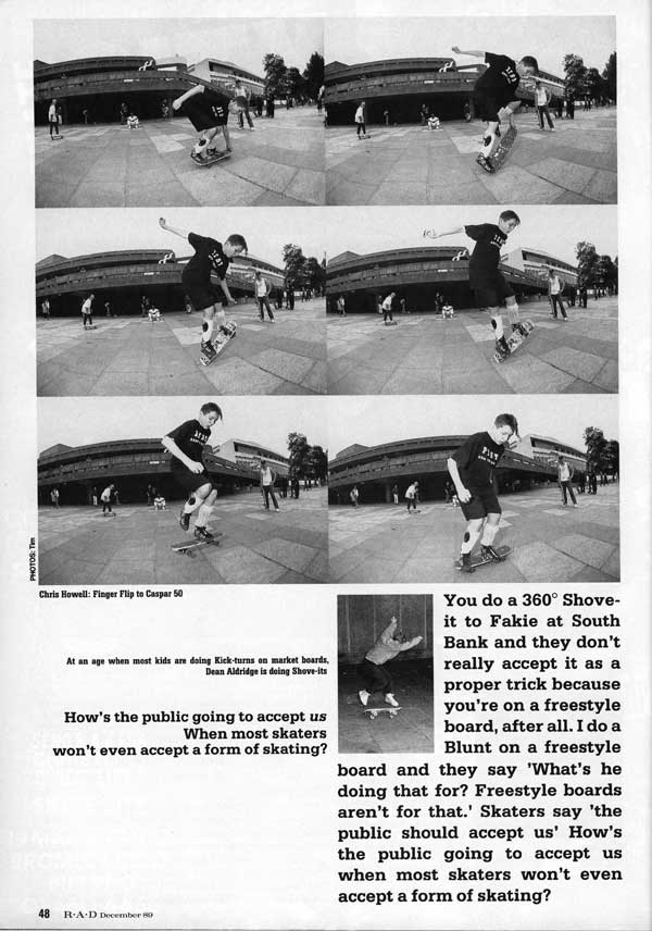 The conluding page of this story about the meeting point between freestyle and streetstyle skateboarding includes the plea: “How’s the public going to accept us when most skaters won’t even accept a form of skating?” But who wanted to be accepted in the first place? The divisions within skateboarding are just as much about establishing personal identity as the desire to identify with other skaters.