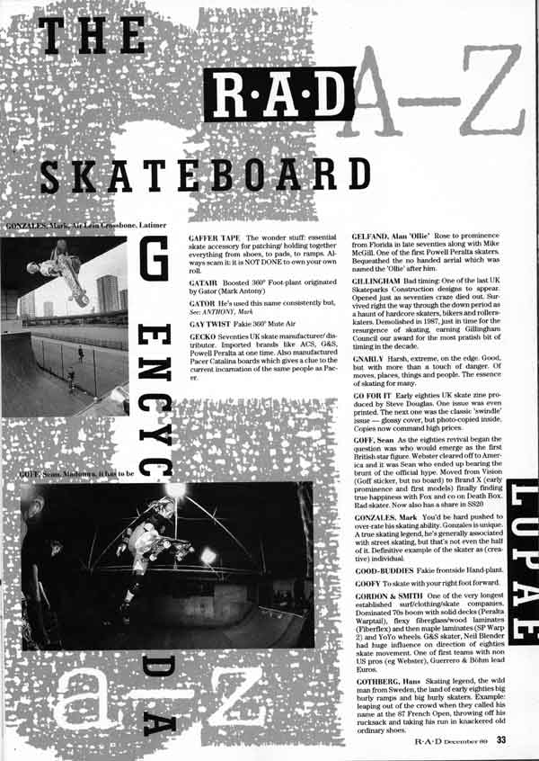G is also for Gator… Alongside various skate gods of different eras we also find references to Steve Douglas’ “Go For It” zine from the dark ages and (topical note: there was a fuss about a BBC DJ using the word “gay” raging at the time of this post) Gay Twists.