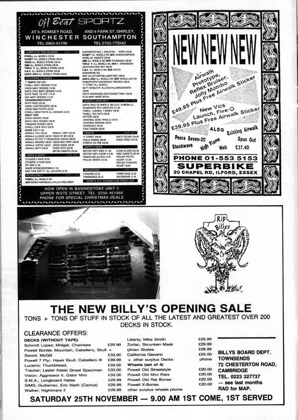 Billy’s and Off Beat Sportz often appeared on the same page. Both were solid supporters of the skate scene throughout these years, as was Superbike in Ilford. There’s a fascination is seeing these old prices as well as the restrictions imposed on the graphics by the technology of the day. That Superbike advert looks as if it was reproduced from a fax — presumably the only way of meeting the deadline.