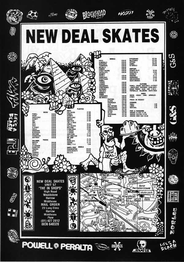 Ouch! Something of a sensitive subject… Here’s an example of an early New Deal Skate advert from the days when the shop was in the “In Shops” near Harrow and Wealdstone station, before they moved to the skatepark. And, yes: they were doing mail order right from the start, although the “HSC” name came later.