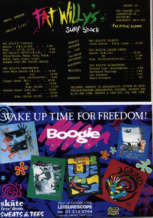 Where did Fat Willy’s fit into all this? At the time their stickers seemed everywhere and therefore absolutely no part of the underground skate culture. Both this and the Boogie designs adverts may seem innocent enough now, but at the time they would have stood out like sore thumbs.