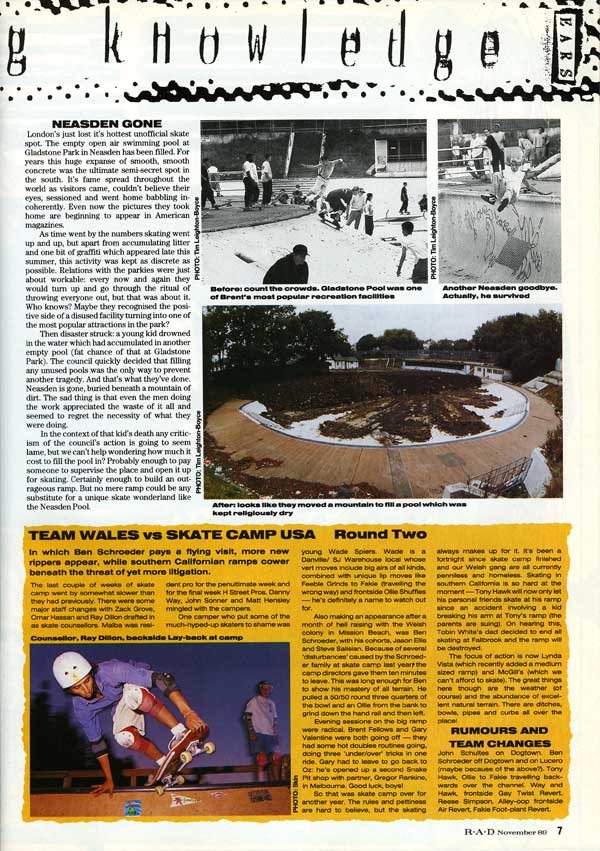London’s just lost it’s hottest unofficial skate spot. The empty open air swimming pool at Gladstone Park in Neasden has been filled. For years this huge expanse of smooth, smooth concrete was the ultimate semi-secret spot in the south. It’s fame spread throughout the world as visitors came, couldn’t believe their eyes, sessioned and went home babbling incoherently. Even now the pictures they took home are beginning to appear in American magazines.