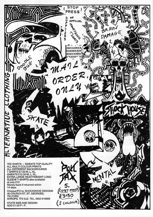 I don’t remember much about this outfit. Mail order T-shirts from Telford… I have a vague idea this was an individual skater trying to get an independent brand going, in the spirit of Anarchic Adjustment, Insane and so on. In which case I think I would have been worried that they were spending so much money on a big advert like this instead of starting smaller and growing.