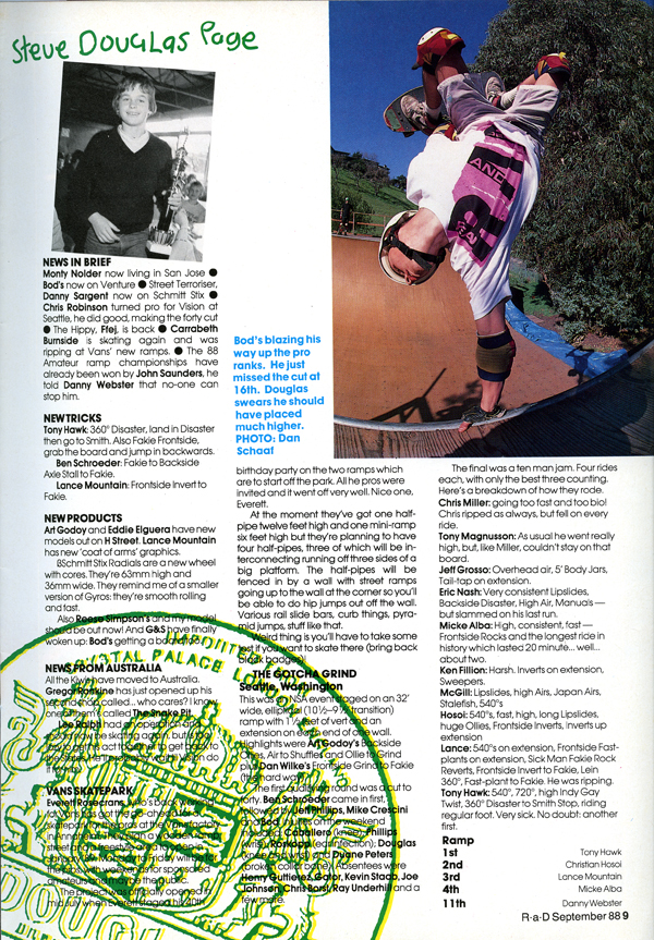 Listen out for Dobie on the Peel Show, he’s just recorded a session for them but forgot to tell us who he was backing; or when it’s going out. More rumours flying about in Livingston: seems like an indoor park is& expensive, but an extension to the existing one is a possibility Talking of Livingston, are the Scottish Pool Championships taking place on August 27th and 28th? The SSA presumably know, but they aren’t telling. Update on incestuous Taiwanese: last month it was copies of Pacer Maniacs, this month fake Transmissions hove been spotted in Dunstable. Simple rule: you get what you pay for. El 6for a complete board does NOT get you lot. But does £170? Not if it’s Powell deck with Pacer undercarriage. lt’s said that the same establishment asks E20 for each Vision Blur and S4.50 Thrasher. We print no names: we’d like to think that to do so would be libellous, though we hove a horrible feeling it’s all true. Check the prices in the adverts in here before you part with vast quantities of cash. “Skateboarding is Not a Crime” Sez who? The Police Review devoted a page to the subject coming up with various examples of legislation a skater might fall foul of. If they want to nick you they’ll nick you Groholski’s riding for Street Wear now Shoes, shoes, how about signature model shoes? Are Vans talking to a couple of high flying pros? And is one of them holding back to see if the other wants to take up the offer? A real Gentleman It’s not oust watches: Swatch are talking about something similar: siggy PopSwatches as well as ordinary ones. John Grigley was the name being linked with this tale. Vision have got lots of new things on the way. No sooner do the first VexCons appear than they come up with an even newer concave with a big upturned nose, steep tail and double kick also killer new shoes a bit like Air Jordans and new minimalist graphics all round @Todd Anderson and Pete Augustine are on Redline Craig Savage Flower and Love Tree Grasso also off to pastures new, rumour has it. New bike street tricks: Lipslides on a bike. You go up, do a rolling endo on your front wheel, pull your rear calliper and as your wheel hits your momentum makes you slide Spike Jonze is your man
