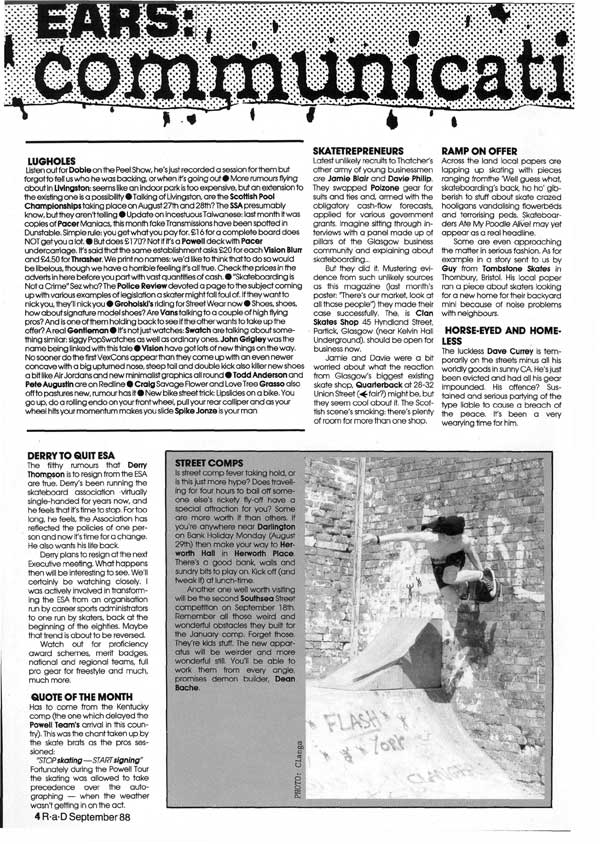 The filthy rumours that Derry Thompson is to resign from the ESA are true. Dews been running the skateboard association virtually single-handed for years now, and he feels that it’s time to stop. For too long, he feels, the Association has reflected the policies of one person and now Ws time for a change. He also wants his life back.